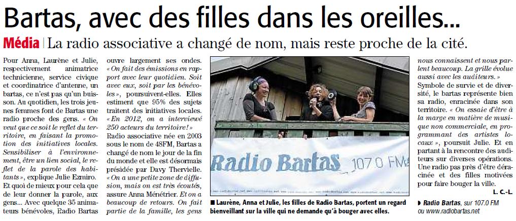 Pour Anna, Laurène et Julie un bartas, ce n’est pas qu’un buisson ! Au quotidien, les trois jeunes femmes font de Bartas une radio proche des gens « On veut que ce soit le reflet du territoire, en faisant la promotion des initiatives locales. Sensibiliser à l’environnement, être un lien social, le reflet de la parole des habitants ». Et quoi de mieux pour cela que de leur donner la parole, aux gens…